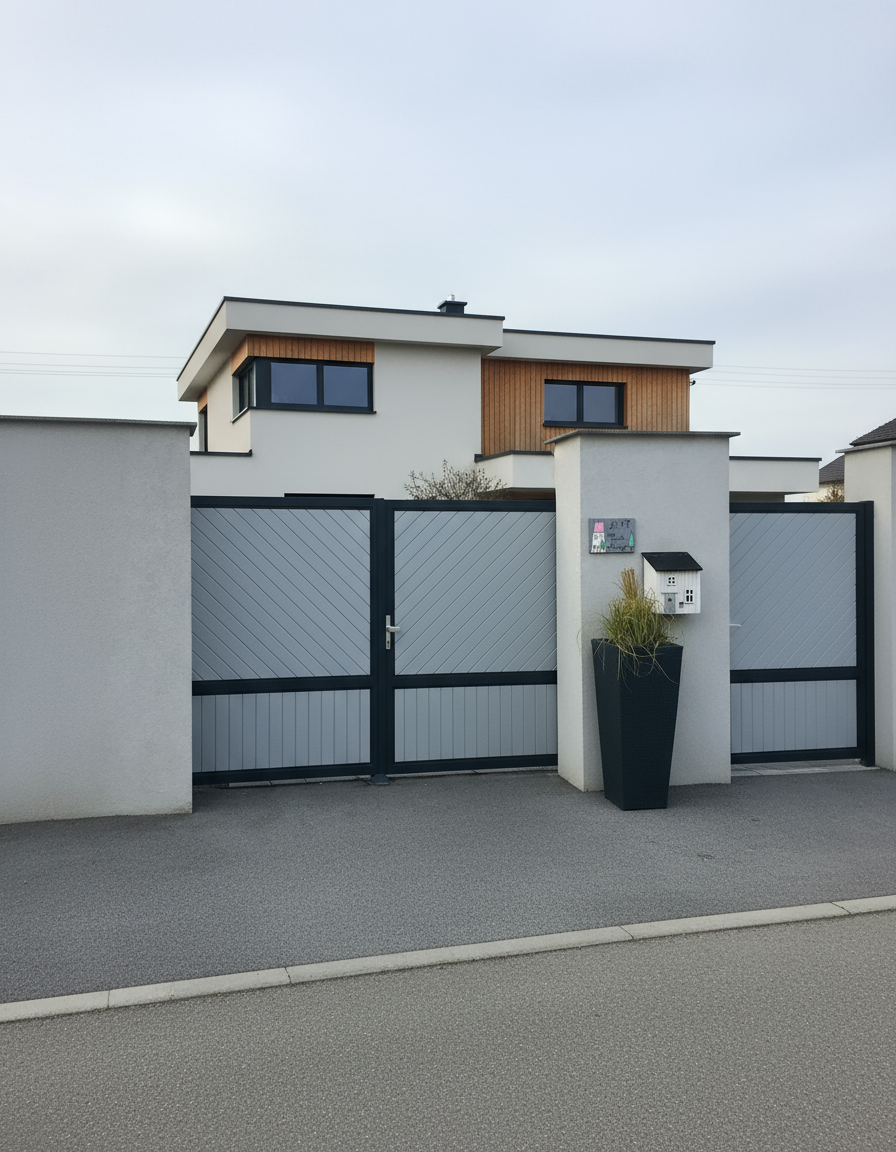 Der RAJNA-Aluminiumzaun wurde mit seiner vollständig abdeckenden, geschlossenen Lamellenkonstruktion entwickelt, um maximalen Schutz und vollständige Privatsphäre zu gewährleisten. Seine modernen, klaren Linien verleihen Ihrem Zuhause einen eleganten Rahmen und bieten gleichzeitig wartungsfreie Langlebigkeit.